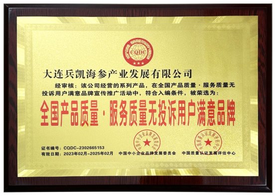 兵凯海参,坚持品质至上;始终贯彻坚守诚信的原则。日前,大连兵凯海参产业有限公司在全国开展的产品质量服务质量用户满意度调研评选活动中,凭借过硬的品质与优质的服务赢得了行业和社会的认可,被专家组委会评为“全国产品质量.服务质量无投诉用户满意品牌”。