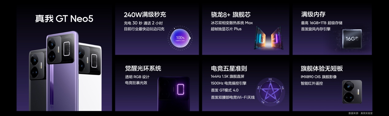 2023年2月9日—中国 · 深圳—realme全新一代潮玩电竞旗舰——真我GT Neo5,于2月9日14:00正式发布。作为科技越级的代表作,真我GT Neo5带来行业首创觉醒光环系统、联合泰尔实验室打造行业首个电竞五星准则、搭载骁龙8+和超帧独显芯片Plus、144Hz+1.5K旗舰直屏,同时最高支持16GB+1TB满级内存组合,更全球首发量产240W满级秒充,以“充电30秒,通话2小时”登顶行业闪充最高峰,将手机闪充真正带进读秒时代。
