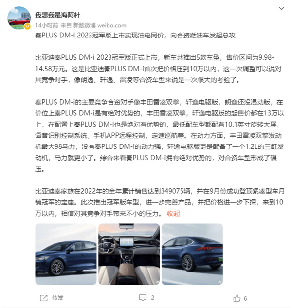 前不久,比亚迪秦PLUS DM-i 2023冠军版正式上市,官方指导价9.98万元—14.58万元,DM-i车型价格首次下探至10万元以内,对朗逸、轩逸、雷凌等合资车型来说是一次很大考验。