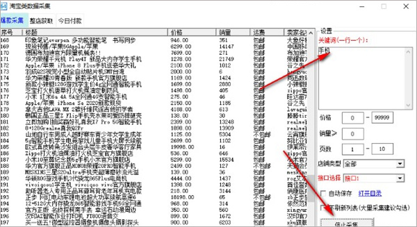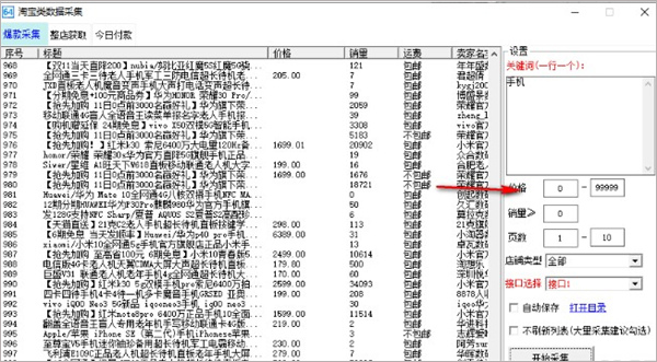 4、点击输入价格、销量、页数、店铺类型等参数可以对数据采集进行过滤。