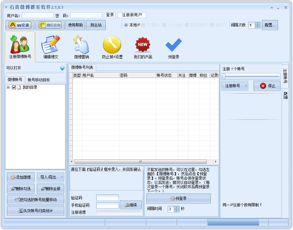 石青微博群发软件是一款功能强大的自动微博群发工具,此款软件包含群发,私信,评论,留言,转发,收藏,加粉,取粉,传图,传头像,发多媒体微博。