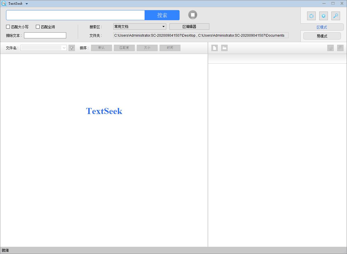 4、TextSeek提供了两种搜索模式:区模式和易模式。用户可通过点击右上方的标签按钮来切换模式;