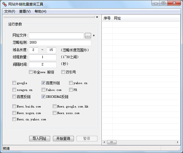 网站外链批量查询工具是一款简单易用的外链查询工具,可以批量查询网站的外链,也可以针对大量网站进行多个搜索引擎的同时查询,特别适合联盟站、网址站、SEO站的站长使用。