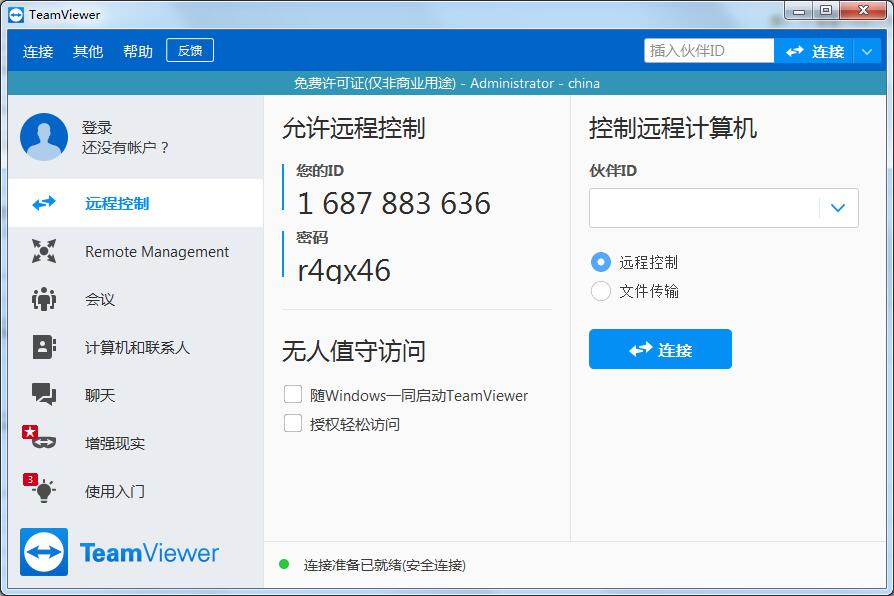 为了连接到另一台计算机,只需要在两台计算机上同时运行TeamViewer即可而不需要进行一个安装的过程。该软件第一次启动在两台计算机上自动生成伙伴ID.只需要输入你的伙伴的ID到TeamViewer,然后就会立即建立起连接。