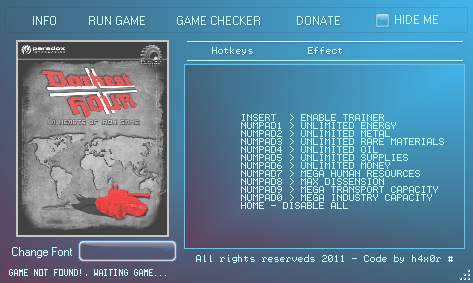 钢铁雄心3修改器是一款拥有10项作弊功能的游戏辅助,能够修改能源,金属,材料,石油,补给,金钱,人力资源等参数,打开修改器后,再进入游戏,然后按INSERT免费,再按相应的热键即可。