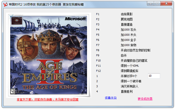 帝国时代2修改器是该款同名经典即时战略类游戏——《帝国时代2》的作弊工具。该款帝国时代2修改器可进行石头、木头、金子、食物、直接建造、展现地图、直接胜利等16项操作设置辅助,大大降低游戏难度,让你轻松玩游戏!