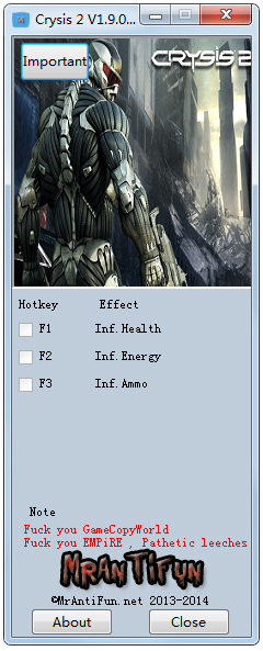 孤岛危机2三项修改器是一款同名下的游戏辅助工具。孤岛危机2是一款动作射击类游戏,玩家可以通过辅助来得到生命,子弹等,让你轻松玩游戏。