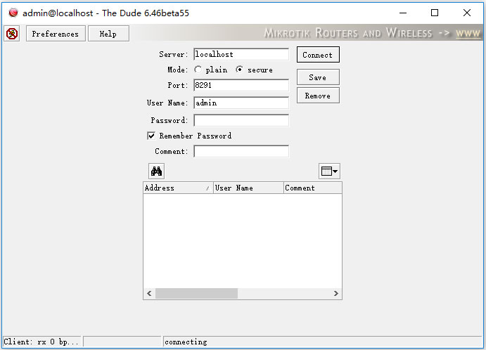 The Dude是一款功能非常强大的网络监控器,它通过自动搜索指定子网内的所有设备,绘制和生成网络拓扑图,监视设备的服务器端口,能为网络提供监视和网络分析的功能,并在服务段端口中断后发出警报和提示,记录到当前的日志中。