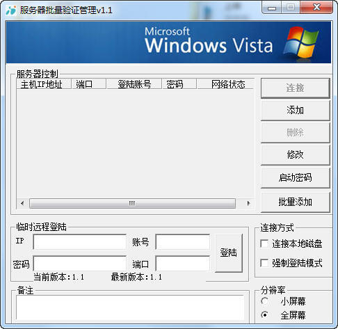 服务器批量验证管理是一款远程服务器验证管理器,作为一款专业的服务器管理辅助小工具,界面小巧、操作简单,能快速服务器控制登入操作,同时支持批量添加服务器IP地址的功能,让您能轻松的远程控制成百上千的服务器,非常方便实用。