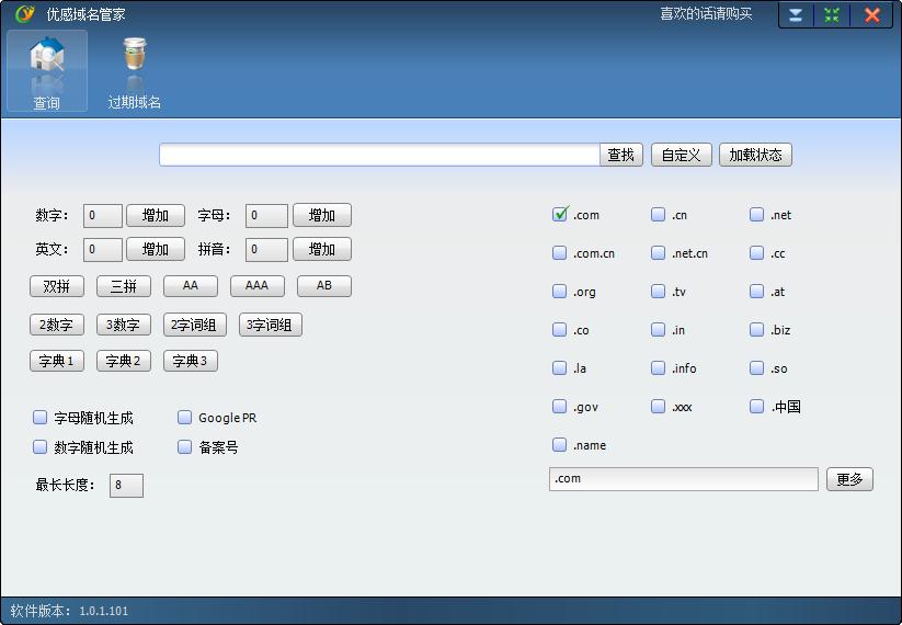优感域名管家是一款专业的域名工具,提供智能输入功能,提供词组、字母、拼音、数字、英语等组合方式查询,也可使用手动方式和导入文本导入字典组合查询,速度极快,操作简单,批量域名同时搜索,同时支持多种域名查询,如:xxx、com、net、org、biz、co、cc、la、cn等。