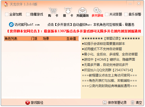 全自动押镖/PK反击/新老三环/存仓/种花/浇花/帮会聚宝盆/帮会每日事务/试炼幻境/全自动刷马/打图/挖图/刷怪/采集/种植/师门任务(自动取钱自动购买)/天下第一擂/抢元宝/洛阳苏州抢打造图/九州商会合区抢店/零点抢店/科举答题/自动更换珍兽共生血祭/自动挖藏宝图/自动填满背包进副本/百花缘任务/自动领波斯玫瑰、自动领离火等日常/漕运/捎口信/百变脸谱/所有帮会任务/抢小抢反/门派宵小/造反恶贼/幸运快活三/自动许愿/自动PK/子女任务/楼兰寻宝(刷箱子)/刷棋/踢球/峨嵋全自动同盟本帮好友加血机/协助队长攻击/跟随队长或指定目标/全自动全屏拾取捡包/拾取过滤/自动清理背包销毁物品/地宫四层古墓九层圣火宫等自动返点/多点循环挂机/全自动加工材料边打边加工/天劫楼任务/自动喊话…更多功能等待用户发现!增加马服。