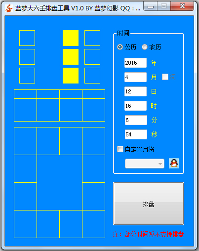 蓝梦大六壬排盘工具是大六壬排盘工具中的一种,大六壬为传统预测三式(三式:奇门遁甲、太乙神数、大六壬)之一。本工具的操作方法非常简单,只要设置好排盘时间及月将,单击排盘,即可排出六壬式盘。