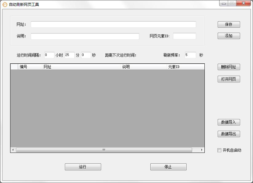 (1) 网址添加功能: 输入“网址”、“说明”和“网页元素ID”后,单击“添加”即可把网址加入到网址列表中;(注意:a、网址是必须要填而且不能添加相同的网址,如果确实需要添加相同的网址可以用“数据导入”功能;b、网址、说明和ID中不能含有逗号和分号。)