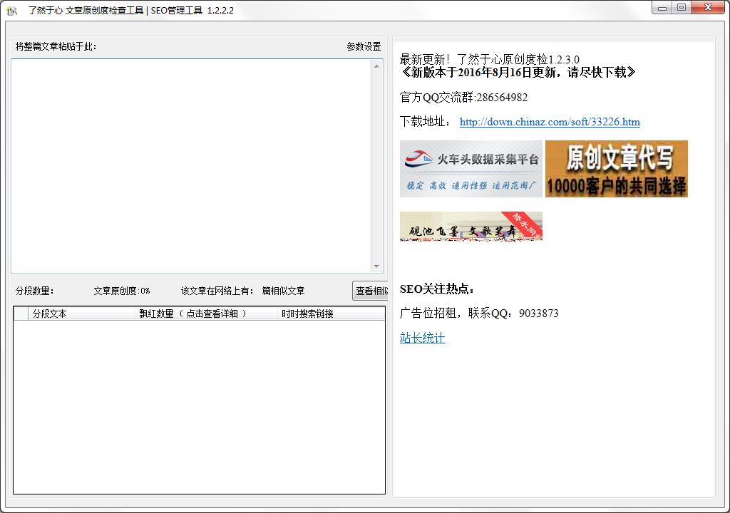 了然文章原创度检查工具是一款实用的用来帮助SEO管理者得网络工具,可以检查文章原创度,准确把握站内文章原创细节,并找出相似文章,杜绝站内、站外雷同甚至近似的文章出现,做到真正的“原创”,在使用了然文章原创度检查工具官方版时需要手工复制要检查的文章,将其粘贴在软件第一个文本框内。