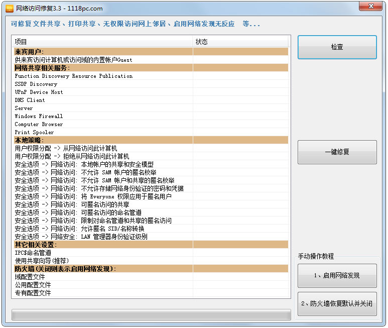 可修复 文件共享、打印共享、无权限访问网上邻居、启用网络发现无反应等网络共享问题。