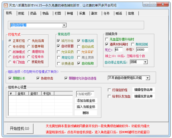 10、支持各种情况下的自动回城补给,回城补给时自动寻找最近城市的各个NPC,自动跑回原挂机中心,支持天外在凤鸣镇补给。