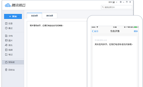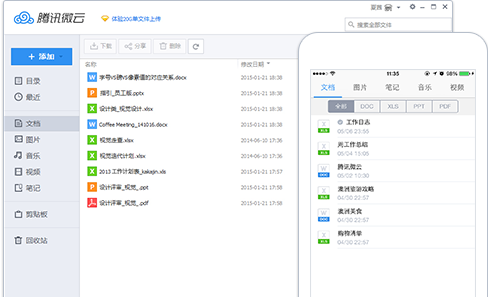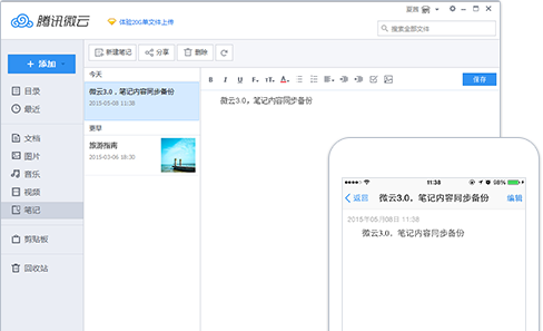 微云是腾讯全新推出的网盘服务,通过微云客户端可以让PC和手机文件进行无限传输并实现同步,让手机中的照片自动传送到PC,并可向朋友们共享,功能和苹果的iCloud较为类似,微云包括PC端、手机端、Web端,用户只要同时安装手机端和PC端,就可实现三端信息互通。