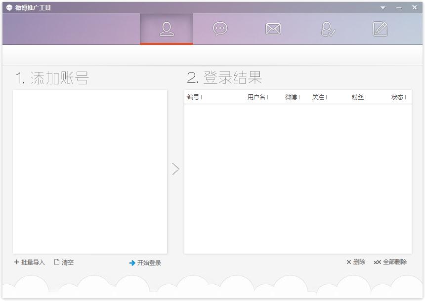 可以批量导入。先用记事本写下你所有的微博账号,用户名和密码用4个-隔开,具体格式如admin@sina.com.cn----password,然后导入txtDB。