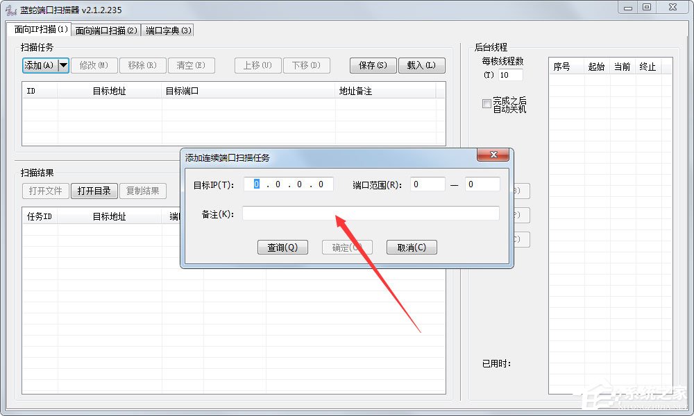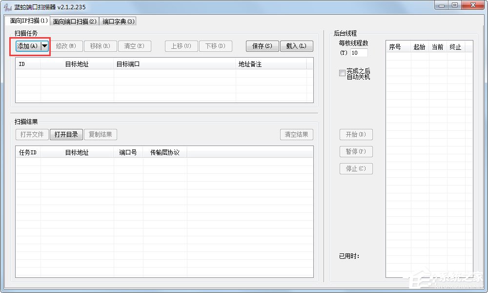 1、打开蓝蛇端口扫描器,这里是添加的功能,你可以在这里添加需要扫描的IP;