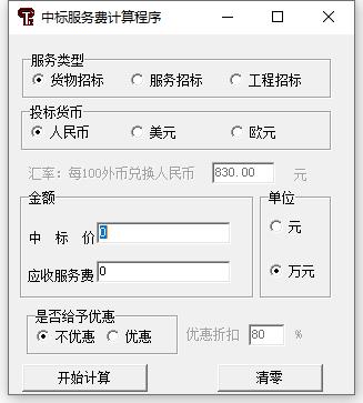 中标服务费计算程序是一款款按照国家的规定计算出实际的中标价服务费的专业计算工具,适用范围广泛,功能丰富强大,可以帮助用户更好的计算最低的招标经费,坚持获得最高的优惠,计算各种税费服务费,帮助用户更好的实现费用的计算。