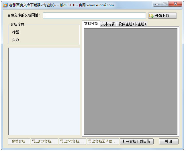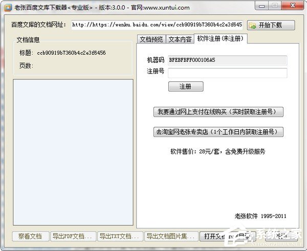 4、如果你已经注册了老张百度文库下载器就可以选择右上角的【开始下载】了,注册界面如下;