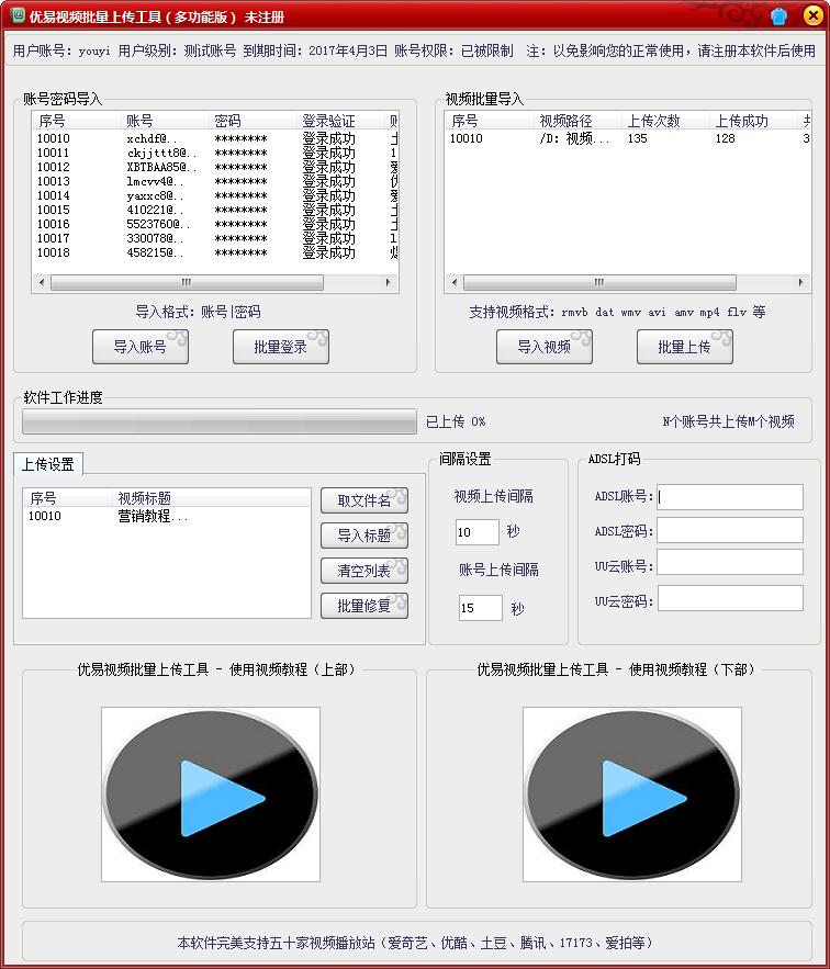 优易视频批量上传工具是一款自动批量上传视频的软件,绿色免费,上传速度快,支持批量上传,不管是长传到网页,还是空间或者云端,都可以帮助你快速完成工作,非常的方便,如果上传视频会消耗大量宝贵的时间,不妨通过这款软件来帮助你快速上传需要的视频文件。