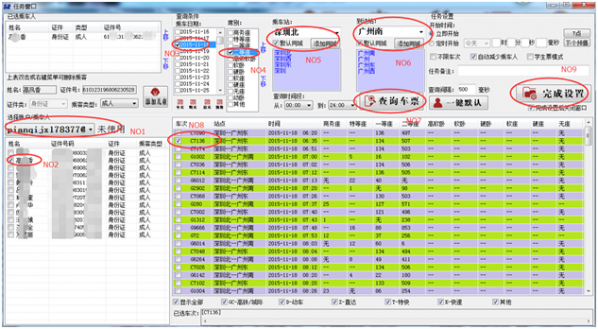 点击主界面创建任务按钮,进入任务界面,创建一个任务的流程是选择帐号——选择联系人——选择出发时间——选择座位席别——选择出发站点——选择到达站点——查询车次——选择车次——完成设置,任务开始。