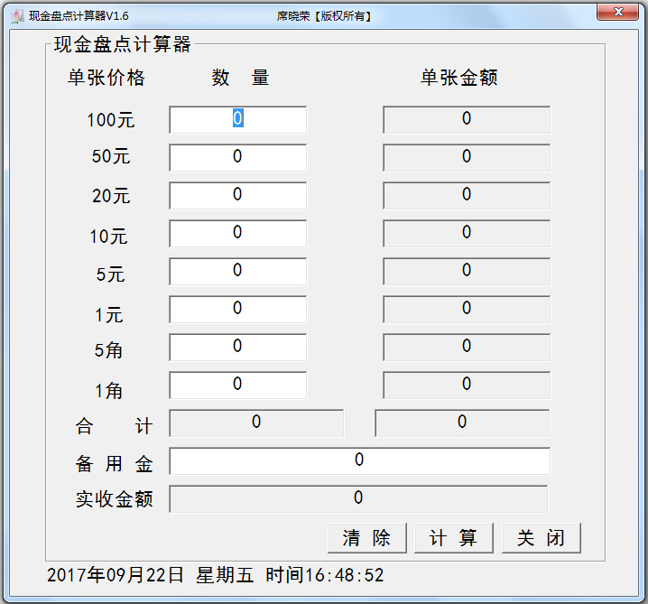 现金盘点计算器用于财务出纳的现金盘点,其中备用金为减项,输入现金单张的数量,载减去备用金,为最终金额合计。
