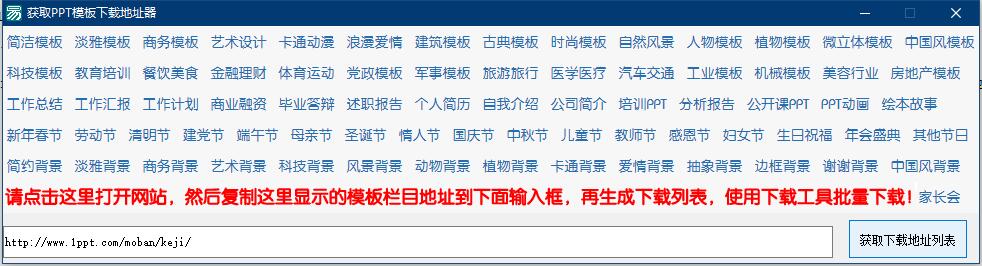 获取ppt模板下载地址器,易语言编写的软件,添加了正则获取列表和地址,用了精易模块,软件可以一键获取某栏目的所有PPT模板下载地址,然后把生成的地址用迅雷批量下载!