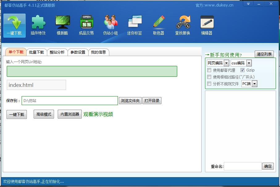 都客仿站高手,一款能够自动检测网页编码,远程下载网页,同时支持同域名和跨域名下载css文件(导入Css文件)、js文件、Flash文件,并能够从网页和Css文件中分析出图片和背景图片文件下载到本地。