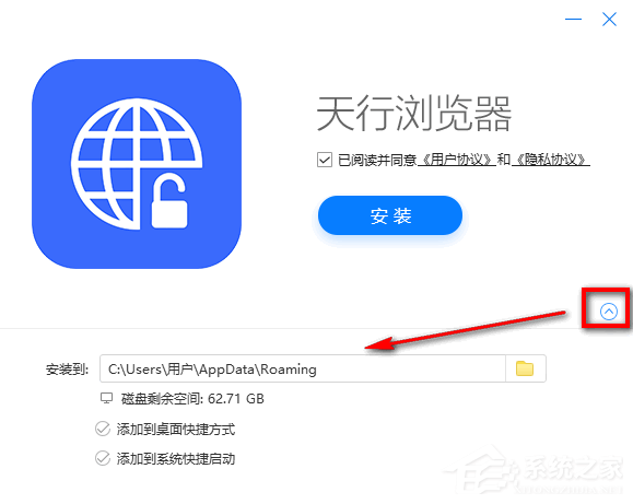 2、如果你想设置天行浏览器安装路径,请根据下图选择红框中按钮,并设置你需要的安装路径。