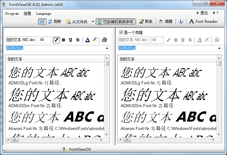 字体预览工具(FontViewOK)是一款可以输入一个字或字符串,便使用所有存在Windows内的字体来呈现对该字或字符串,相当好用。对于经常要使用字体的朋友来说,常常为了挑一个字体对该字的适合显示样式,就必须要一个个来对字体输入后看样式,非常麻烦。FontViewOK中文版的使用非常简单,输入文字,然后选择字体。在字体显示区域,一共提供156种字体选择,只要拖动滚动条,即可浏览字体的效果。 FontViewOK 支持实时预览,让字体选择变得轻松、便捷。特别适合那些对字体要求高的文字编辑工作者。此外,软件还具有打印功能,方便您随时将满意的字体打印出来,慢慢欣赏。