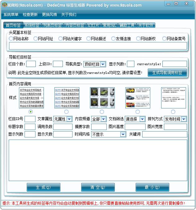 DEDECMS标签生成器是一款方便各位站长使用织梦程序仿站时使用,工具集合了所有dedecms标签,通过网站各部分标签进行分类,所有的标签可以直接点击生成,就可以拿来调用。对于那些刚接触仿站的用户非常实用,不熟悉标签、记不住标签都可以使用这款标签工具。