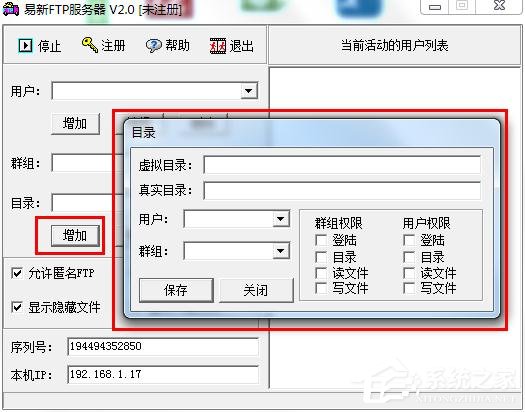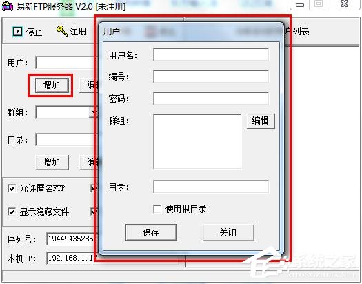 一、打开软件,点击增加,新增一个用户名和群组。