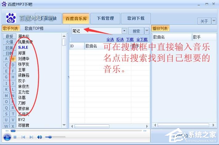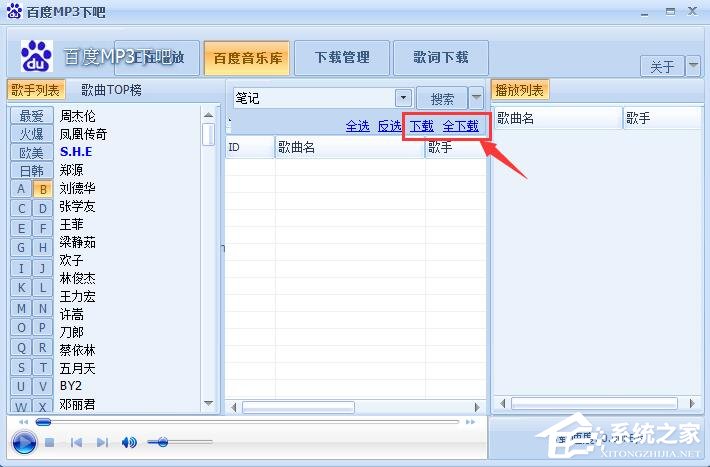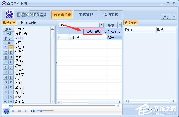 1、一键下载百度top500, top100、热门歌手的歌曲。