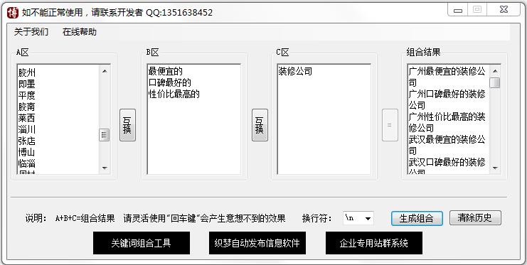 同时还增加了C组,之前的工具是只有两组组合数据的,这个工具扩展到了三组,可以组合更多的相关词,还可以对多个地区组合,如A组写广东,B组可以写广州、深圳、东莞,C组写机票。这样便可以组合更多的目标长尾词。