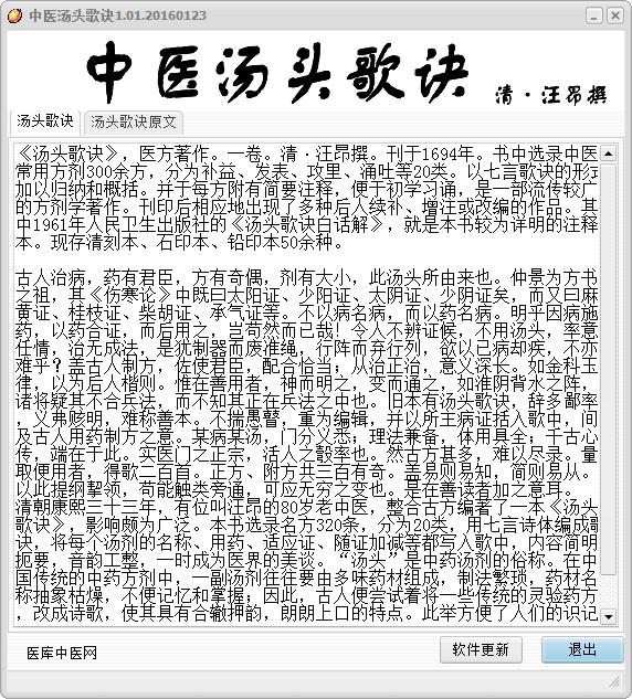 中医汤头歌诀软件里面收录的《汤头歌诀》全文内容,支持离线查阅,方便广大中医用户日常学习使用,《汤头歌诀》,医方著作,一卷,清·汪昂撰,刊于1694年,书中选录中医常用方剂300余方,分为补益、发表、攻里、涌吐等20类,以七言歌诀的形式加以归纳和概括。