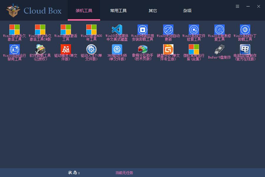 Cloud Box是一款简单使用的电脑小工具合集,作者将各种电脑常用小工作进行了整合,为用户的电脑重装、管理提供了便利,软件中有着各种实用的小工具,从硬件检测到装机工具都能够找到,满足用户的各种电脑小工具合集需求,非常方便。