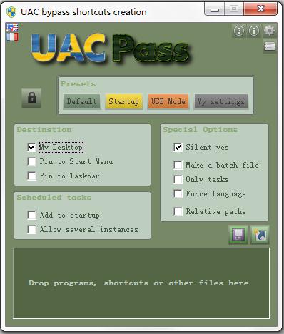 使用方法很简单,勾选好选项后,将会弹出UAC的程序或其快捷方式拖放到下边的框内即可。