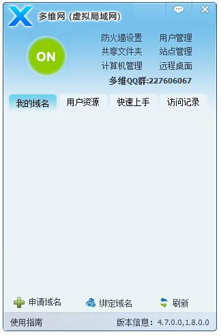 多维互联网是一款可以完成对本地电脑进行动态dns解析的工具,该软件可以允许多用户进行访问,完成对本地电脑进行动态dns,被访问者输入密码进入系统后,访问者将断开连接。