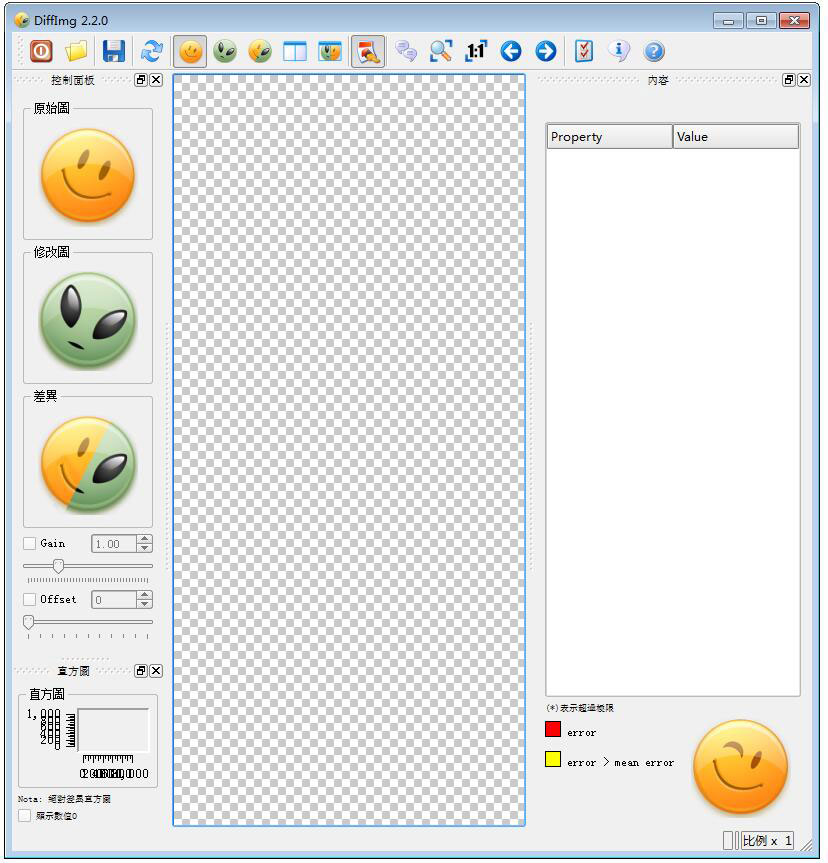 1、点击difference image按钮(半个普通笑脸和半个外星人笑脸的图标),此时两张图片是重叠显示的,这样你就可以看到像软件No1这篇文章截图中那样的结果,所有相同部分会使用黑白的浮雕效果显示,差异部分则使用彩色显示。