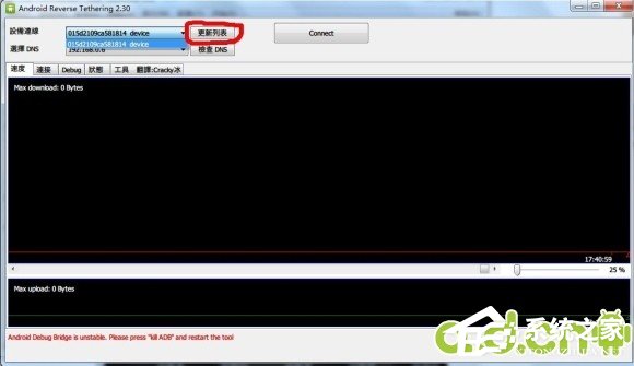 3、点击【更新列表】按钮,会发现你的安卓设备的ID。如果没有更新出来的话,请在电脑端关闭豌豆荚等占用【USB调试】的程序;