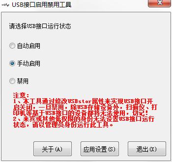 1、本工具通过修改注册表中的属性来实现USB接口开启关闭,一旦禁用,除USB存储设备外,扫描仪、打印机等基于USB接口的设备都将无法使用,切记!