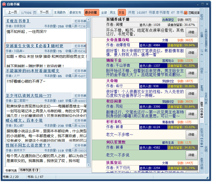 自助书城是一款小巧且实用的电脑小说阅读软件,支持起点、纵横、17k、创世、掌阅、追书、优书网等七大主流的小说平台,任你下载,几乎包含全网所有的小说书籍,支持搜索、查看、下载三个主要的功能,无论是在线阅读还是下载以后离线查看都很方便。