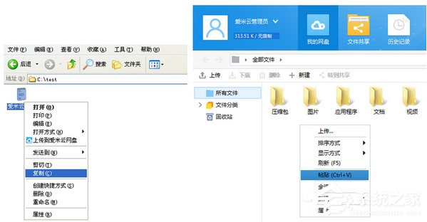 3、从系统文件夹中选择文件,右键菜单中选择复制,然后在爱米云网盘中的右键菜单中粘贴上传文件;