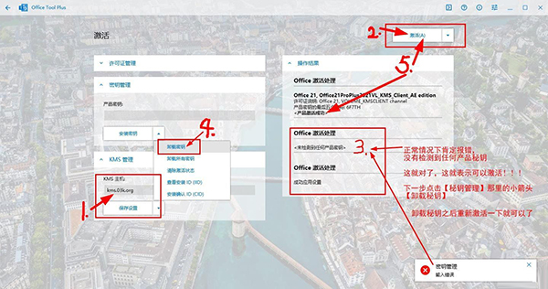 安装Office 2021 结束之后,点击左上角的箭头返回Office Tool Plus ,点击【急火】模块,进入下图界面,请按照1 ---》 5的顺序依次完成。