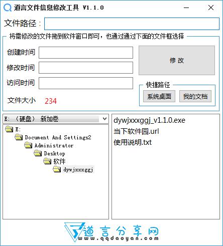 道言文件信息修改工具是一款功能强大的文件信息管理软件,通过使用该软件能够帮助用户轻松修改文件的各种信息,例如创建时间、修改时间、文件后缀等,为用户的信息管理提供了帮助,软件操作简单快捷,满足用户的各种文件信息修改功能需求。