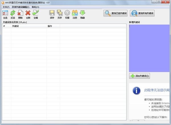 这是国内首款支持阿里巴巴国际站大批量关键词排名的软件。为阿里巴巴国际站用户提供如下主要功能:实时查询阿里巴巴关键词的排名。支持只查询指定业务员的产品排名。批量查询关键词排名(一次最多支持1000个关键词)。