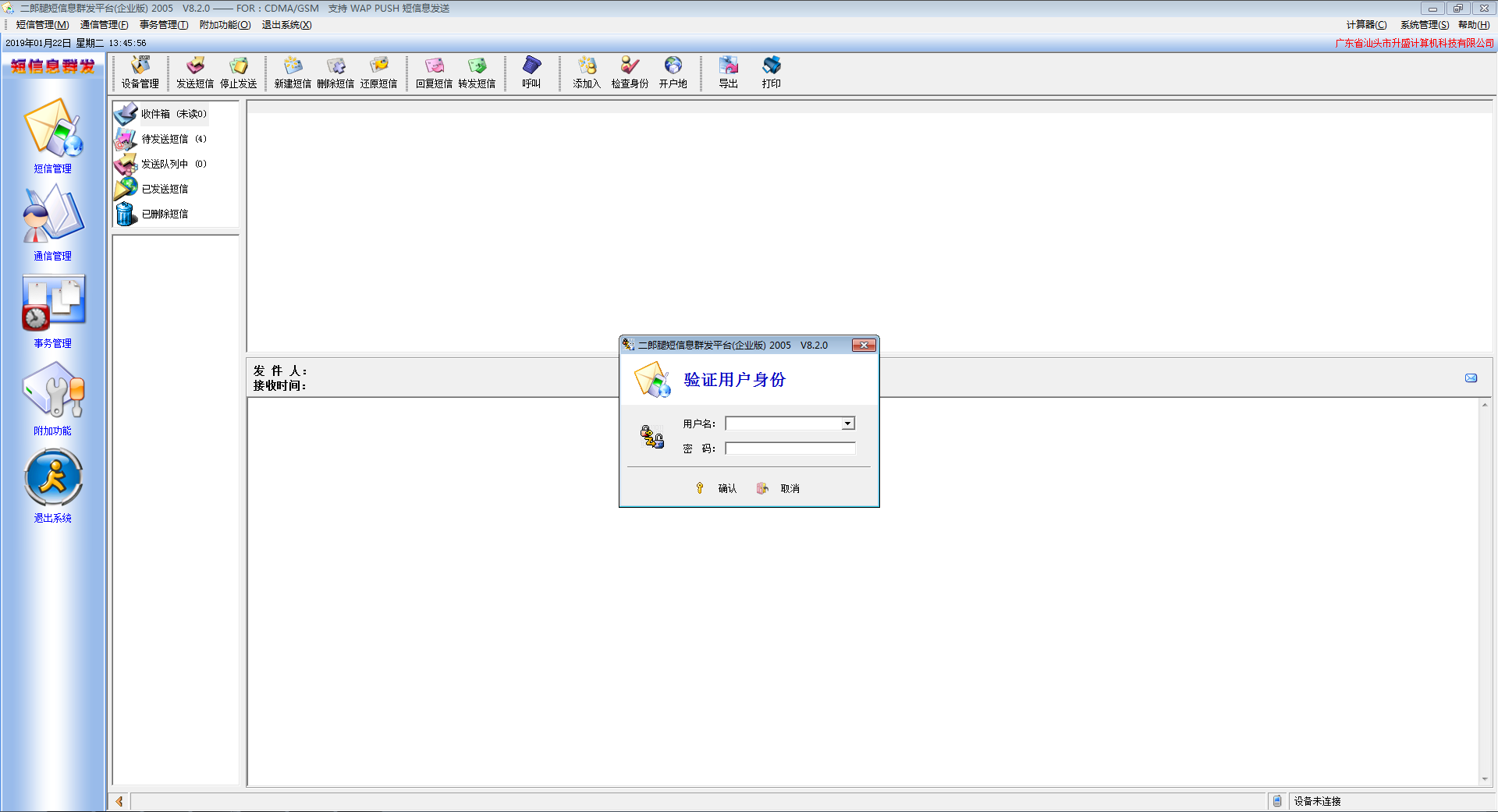 二郎腿短信息群发平台绿色版功能强大、界面友好(类似OutLook风格,操作简便),企业只需很少的投入就可以建立起自己的短信息群发中心,通过该平台可以充分利用移动通讯公司提供的短信息服务功能,来发布各种行业相关信息;如:短信息群组发送(如:业务广告发布推广)、分组发送(如:通知各部门的工作人员 ,在不同的时间及时开会)、批处理发送(自动给不同收件人,发送不同短信息 如:工资发放通知含个人工资金额)……,还可以做到由用户自行定制或查询他所需要的资讯。拥有二郎腿短信息群发平台(企业版)2005就等于拥有了一个信息管理及业务增值的有效工具。注:请合理使用本软件功能,勿做非法用途。