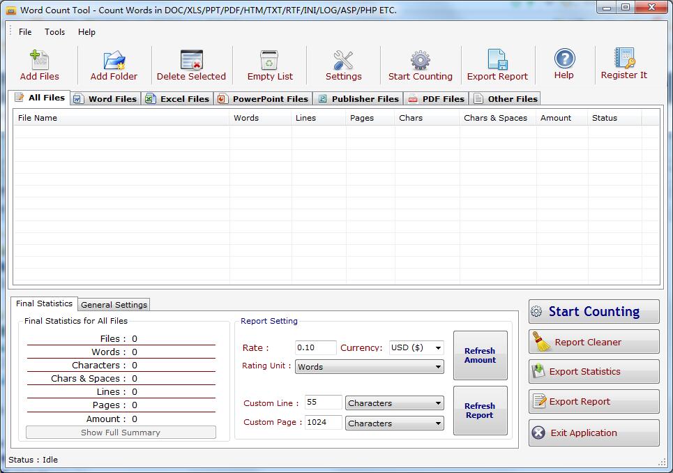 Word Count Tool是一款独特的字数统计软件工具,旨在帮助用户一次性计算多个文件中的字,字符,行和页。